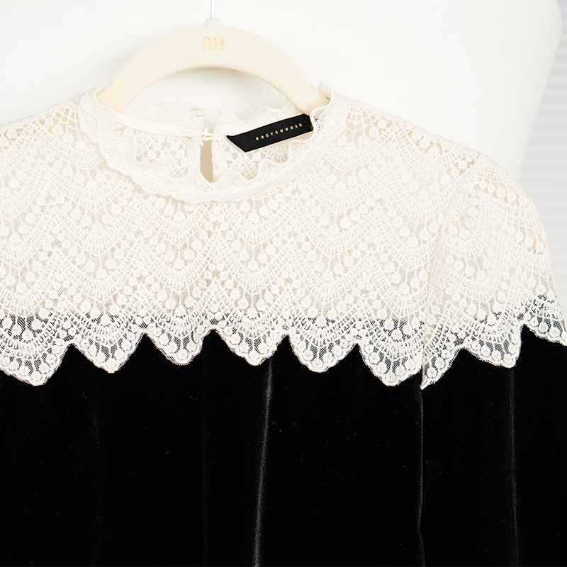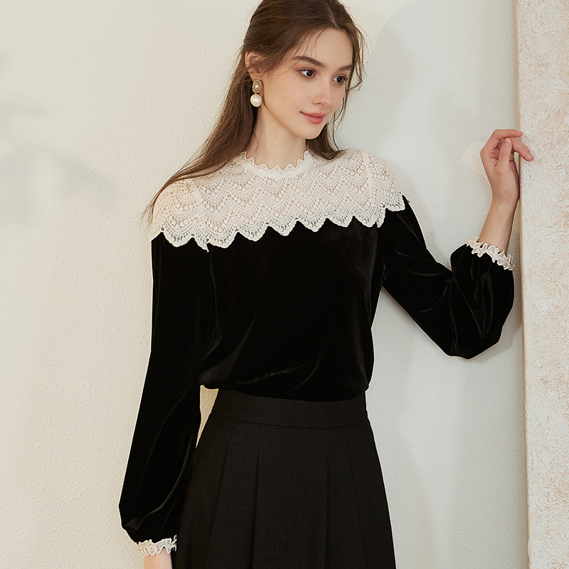 丝绒黑色上衣时尚 罗衣法式 新款 女2025秋季 衬衣09870 拼接蕾丝衬衫