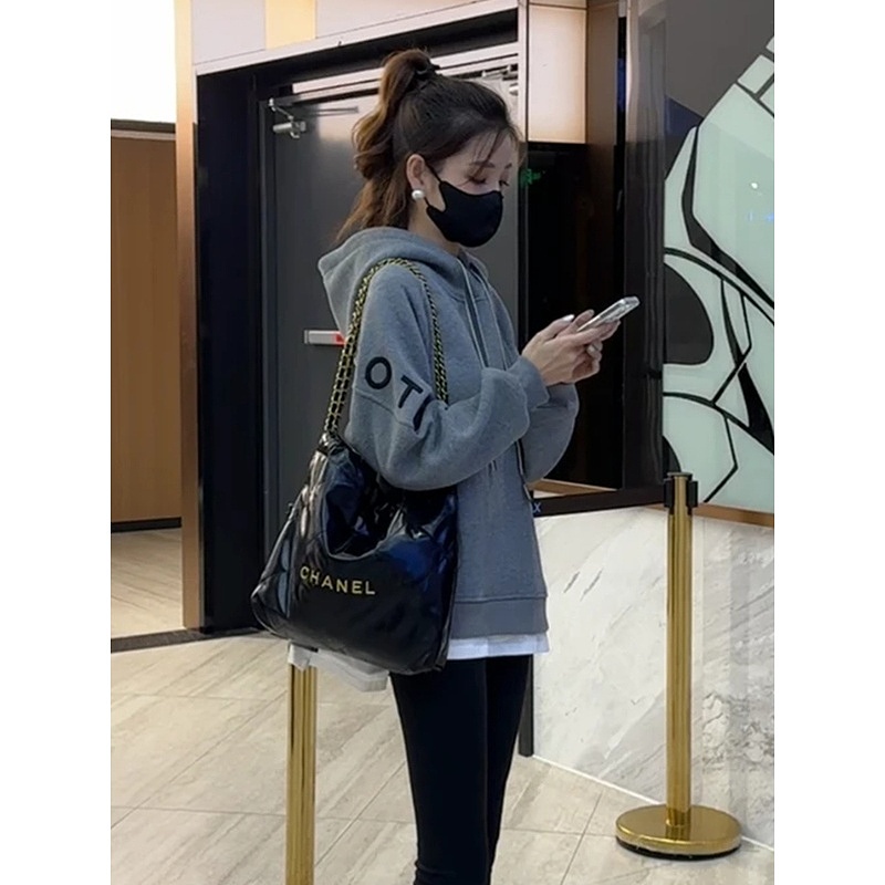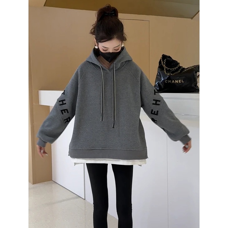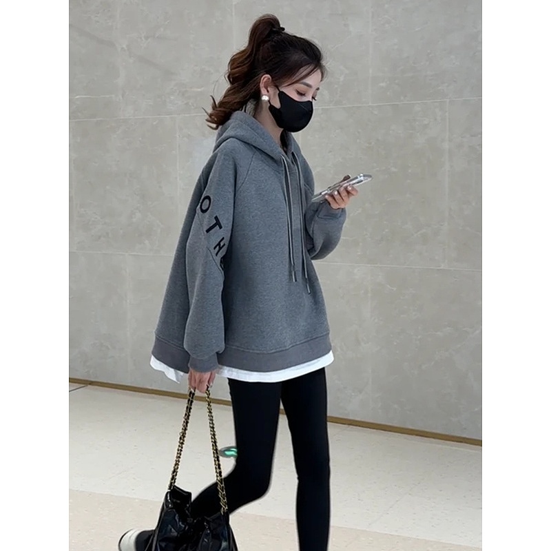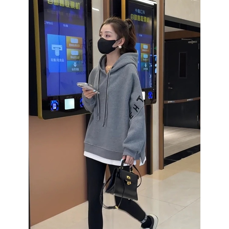 百搭遮肚上衣 新款 灰色加绒加厚字母刺绣长袖 连帽卫衣女2024秋冬季