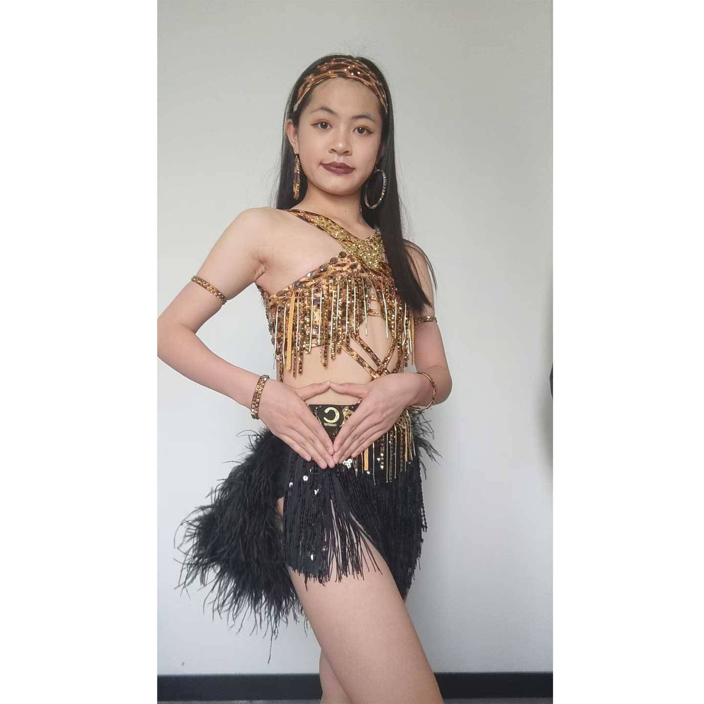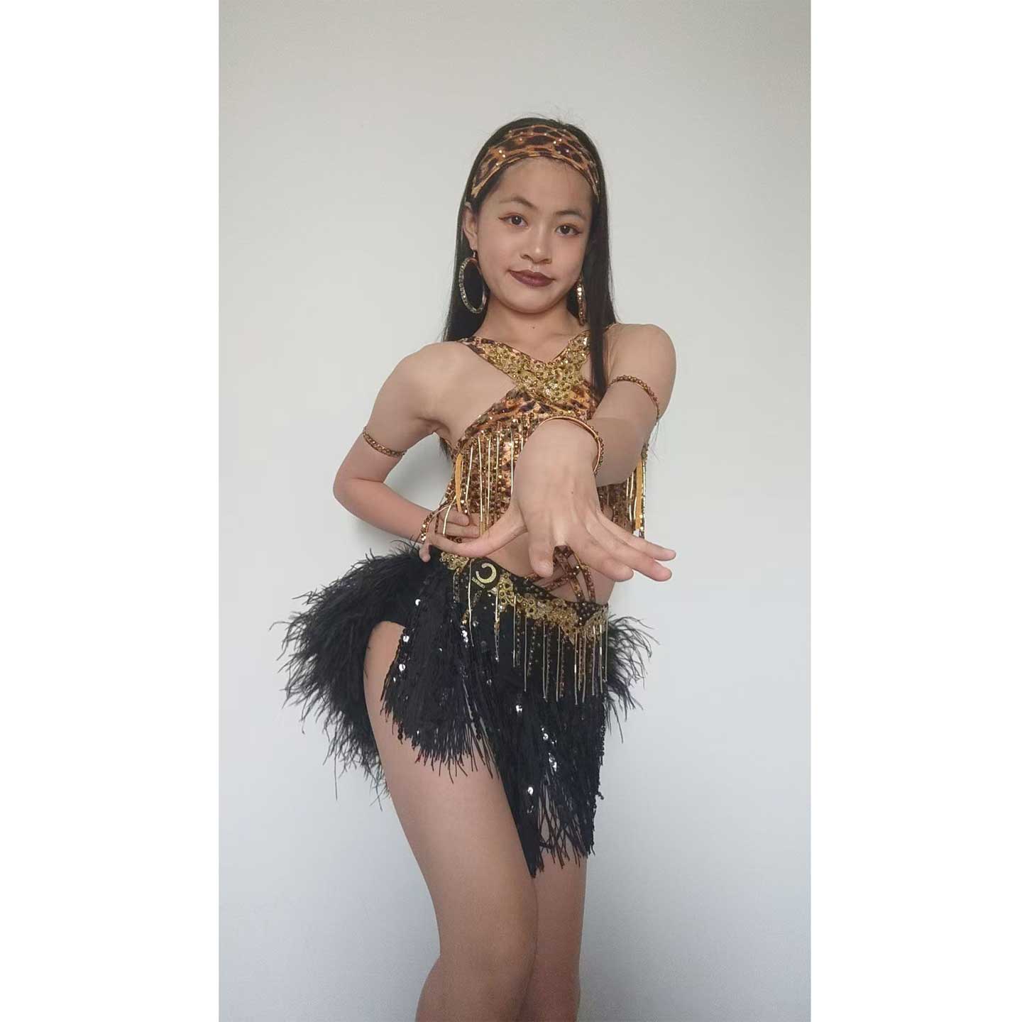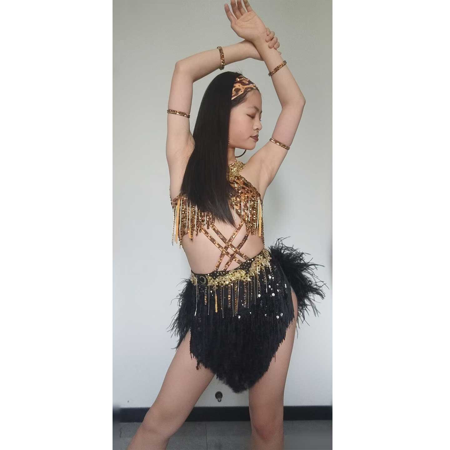 Colorway康乐为豹纹鸵鸟毛镶钻重工女童拉丁比赛花服表演裙25198