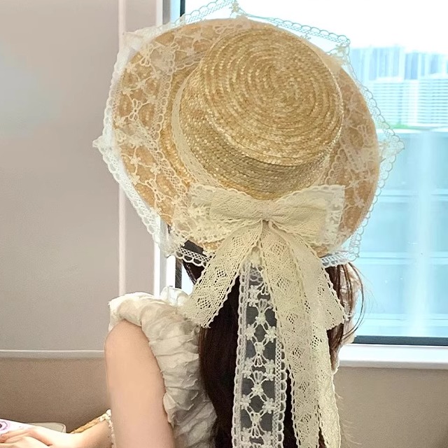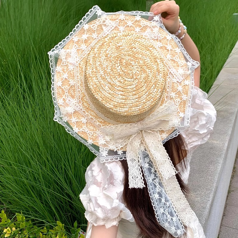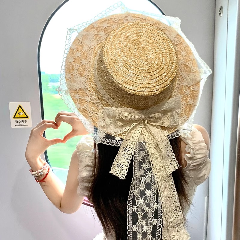 森系甜美沙滩海边遮阳防晒 夏季 法式 蕾丝蝴蝶结平顶草帽女2025新款