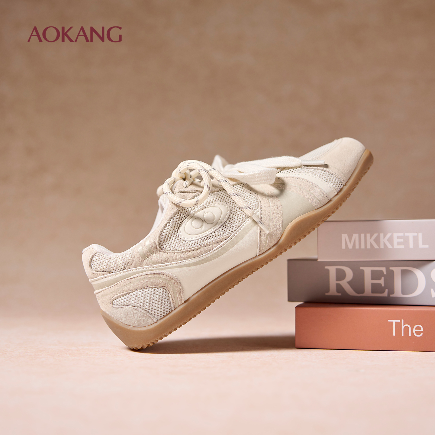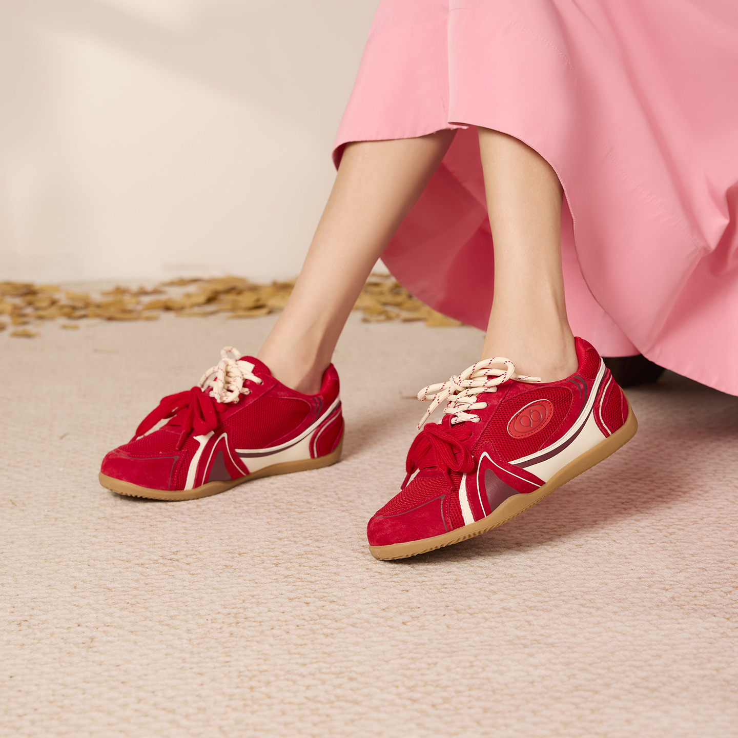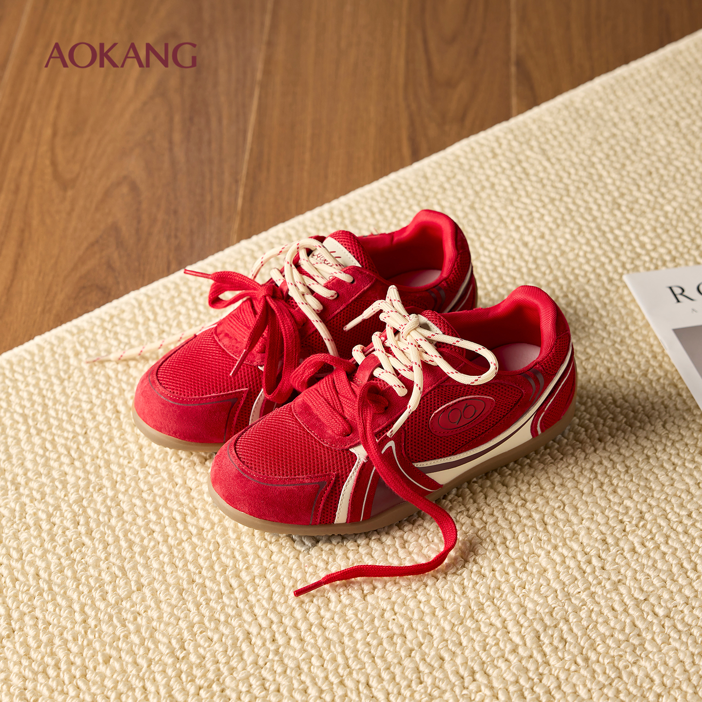 新款 2025秋季 赛车鞋 红色德训鞋 奥康 女复古芭蕾风软底休闲鞋 女鞋