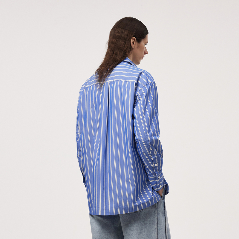 新款 衬衣2025秋冬季 女宽松蓝色上衣内搭 长袖 阔色黄色条纹翻领衬衫