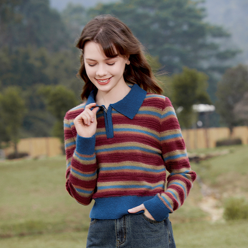 betu百图女2024年秋装 翻领彩色条纹套头宽松毛衣针织上衣 新款