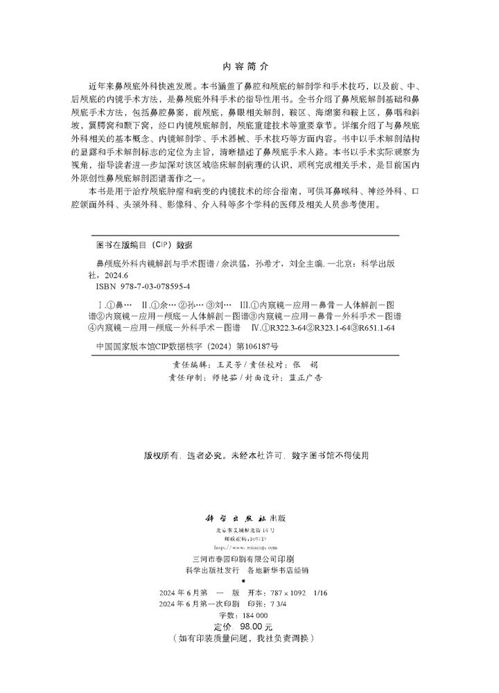 刘全鼻腔颅底解剖学手术技巧内镜方法鼻颅底手术入路外科手术指导参考书籍科学出版 孙希才 余洪猛 鼻颅底外科内镜解剖与手术图谱