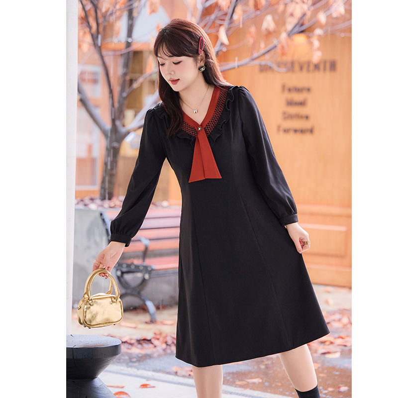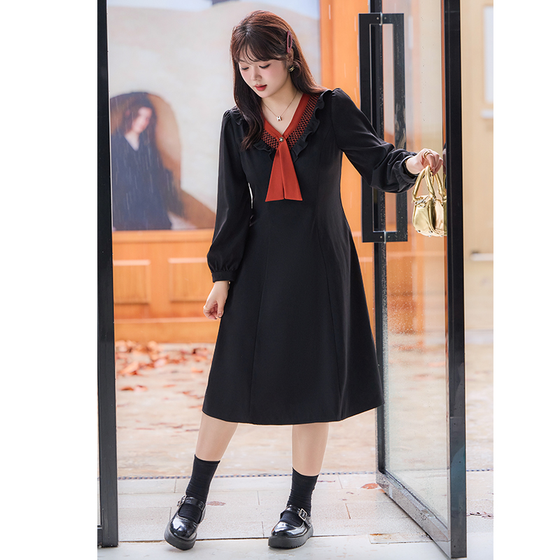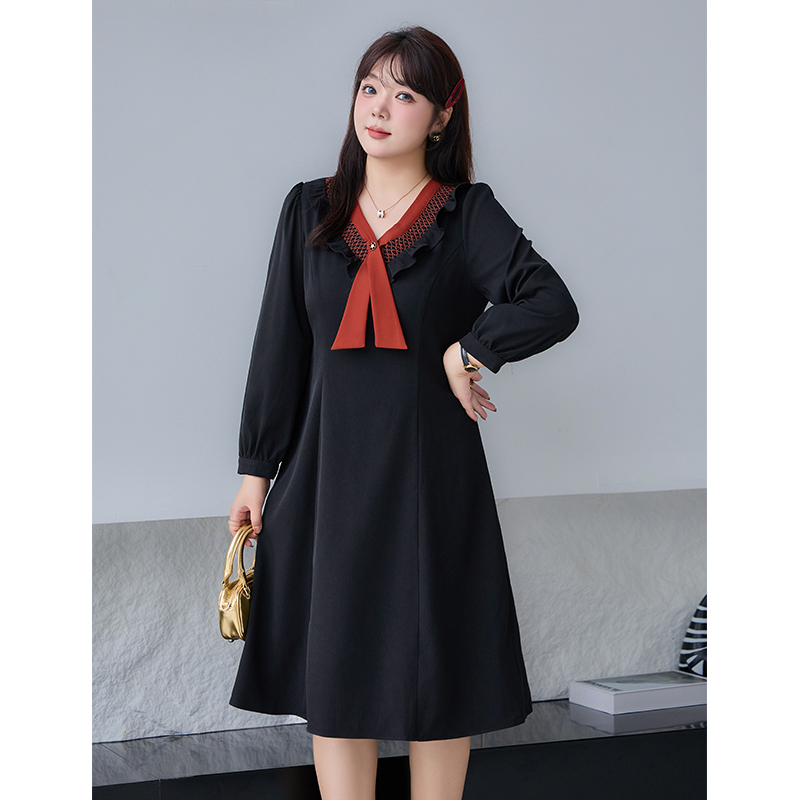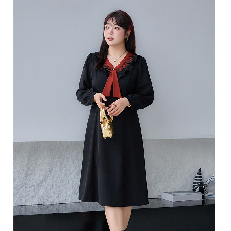 系带蝴蝶结假两件连衣裙女春秋大码 高级感气质收腰中长裙 胖mm法式