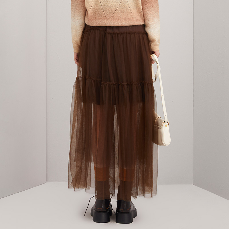 SOMSOM 半身裙春秋高腰显瘦百搭网纱裙 索玛透视百褶裙休闲中长款