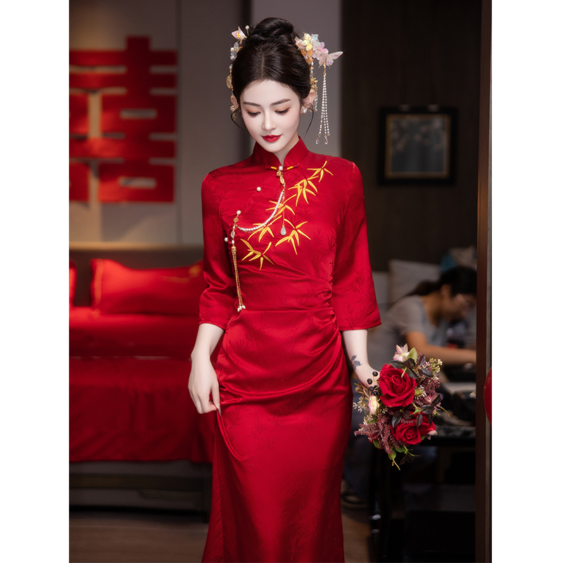 订婚结婚女 夏新中式 红色挂脖晨袍订婚旗袍敬酒服新娘无袖 2025新款