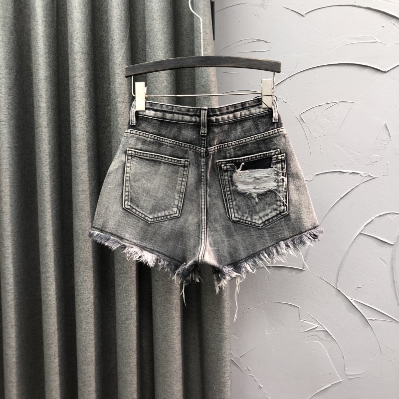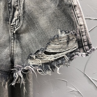 宽松休闲A字毛边阔腿热裤 破洞夏天时尚 女个性 烟灰色高腰牛仔短裤