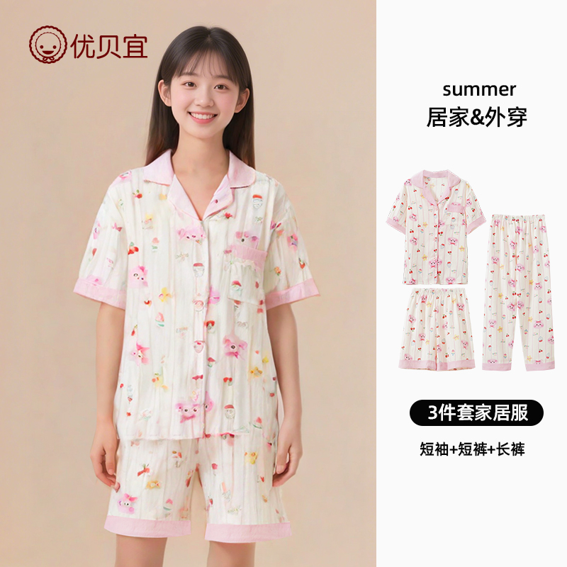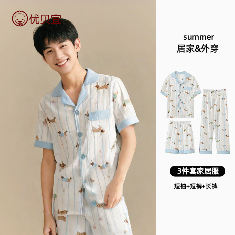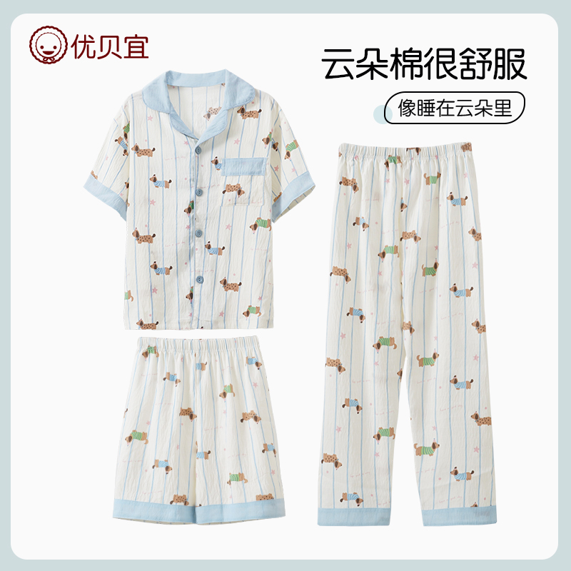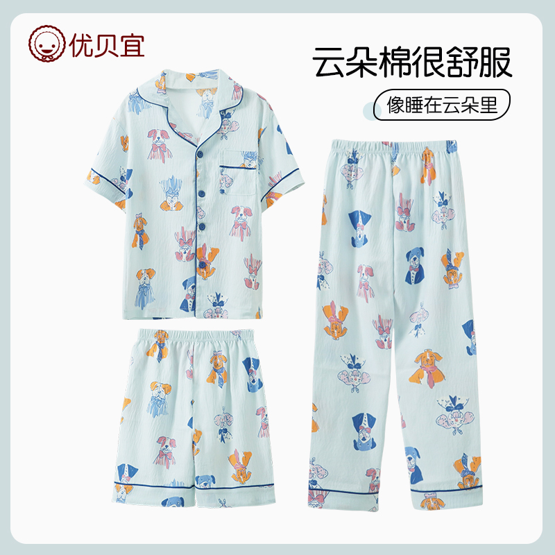 青少年家居服夏装 儿童睡衣男孩空调服夏季 薄款 套装 男童短袖 3件套