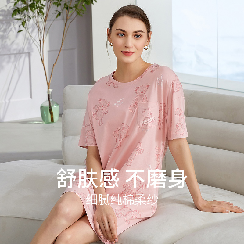 可爱睡衣家居服全棉女款 芬腾睡裙女士夏季 纯棉大码 短袖 连衣裙 薄款