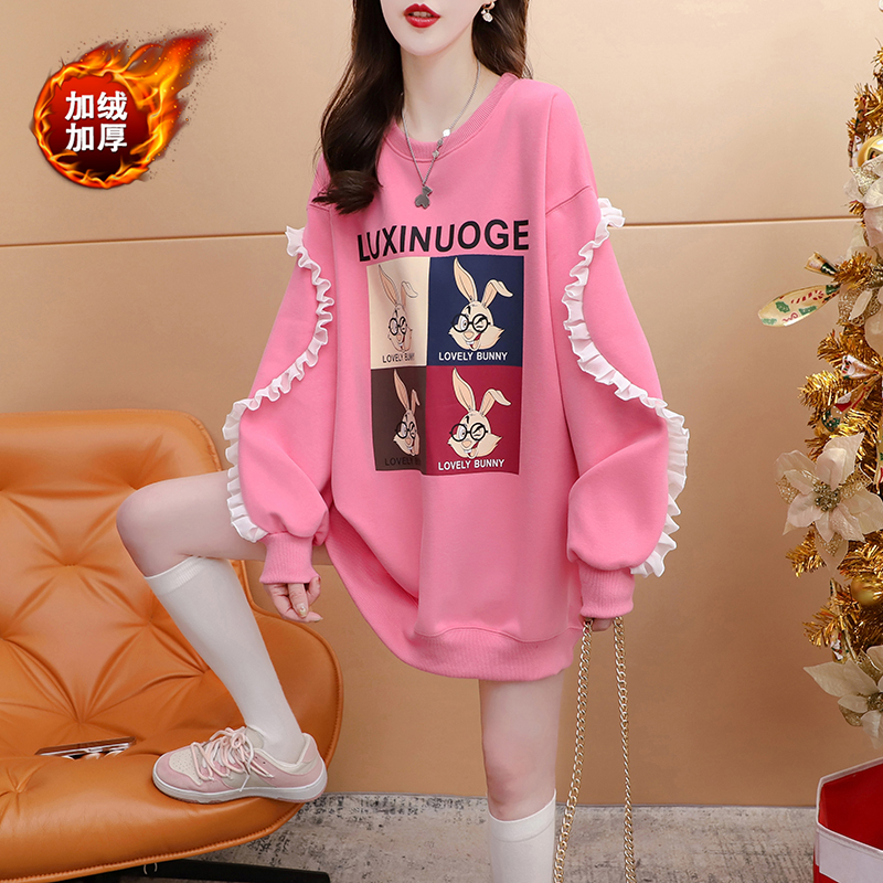 宽松大码 韩版 胖mm加绒洋气上衣 卫衣女秋冬新款 蕾丝拼接设计感薄款