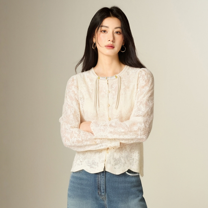 House 开衫 百家好法式 女甜美风花边泡泡袖 上衣 镂空雕花衬衫 Basic
