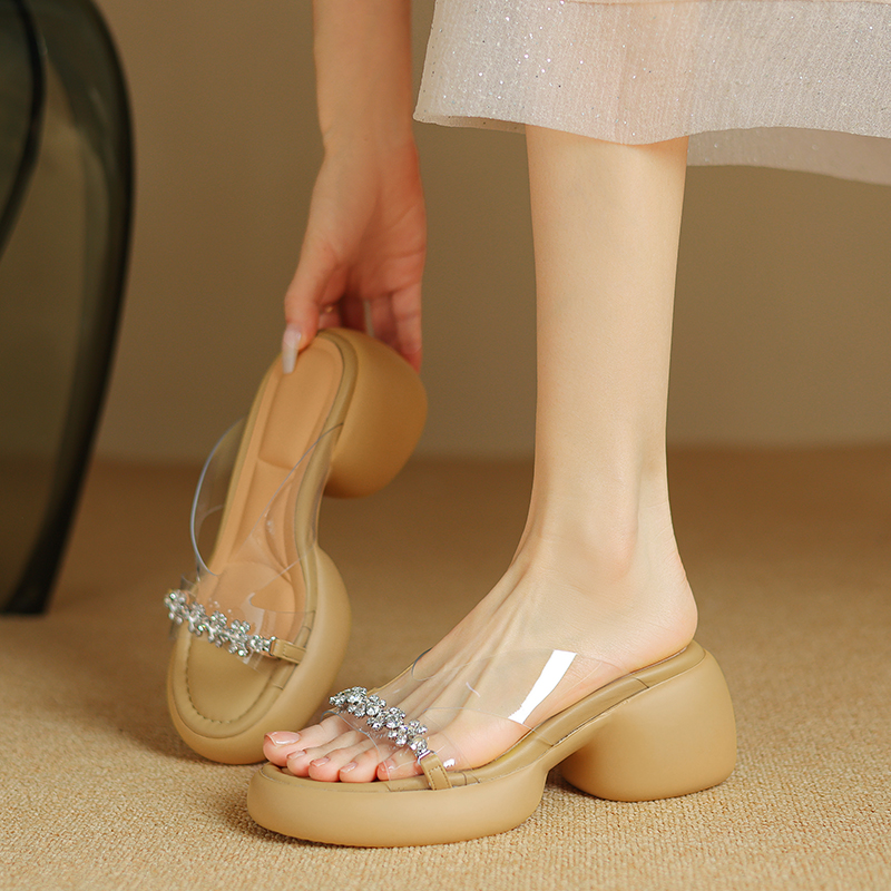 绝美凉鞋 法式 不累脚 女夏外穿厚底软底水钻透明高跟鞋 踩屎感凉拖鞋