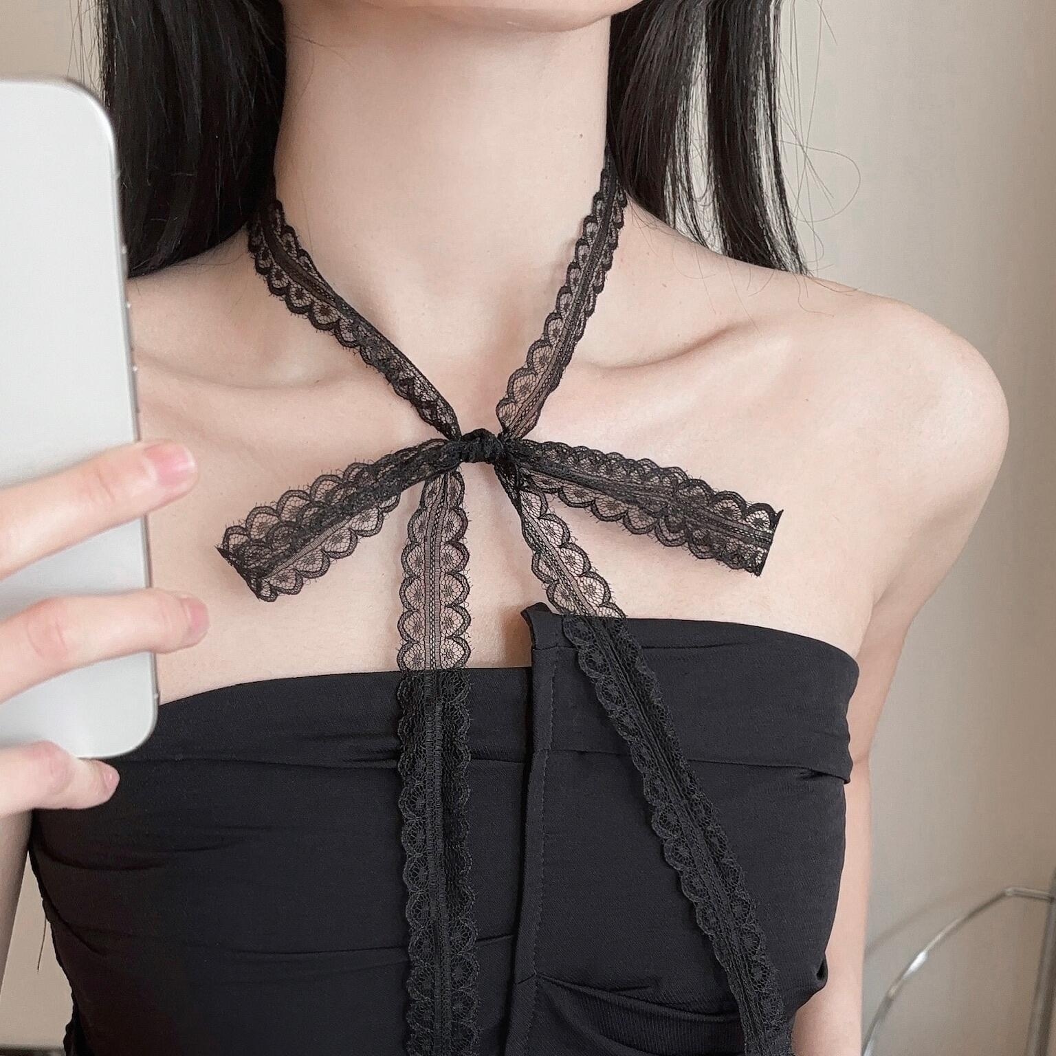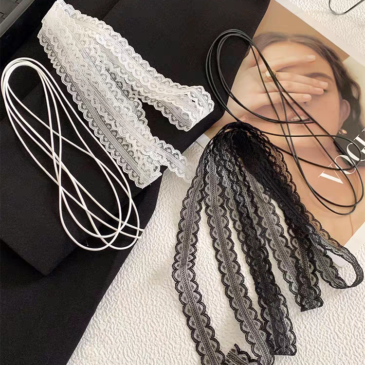 叠戴层次感蝴蝶结白色蕾丝飘带春夏百搭细窄长丝巾女锁骨颈带项链