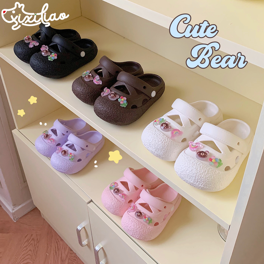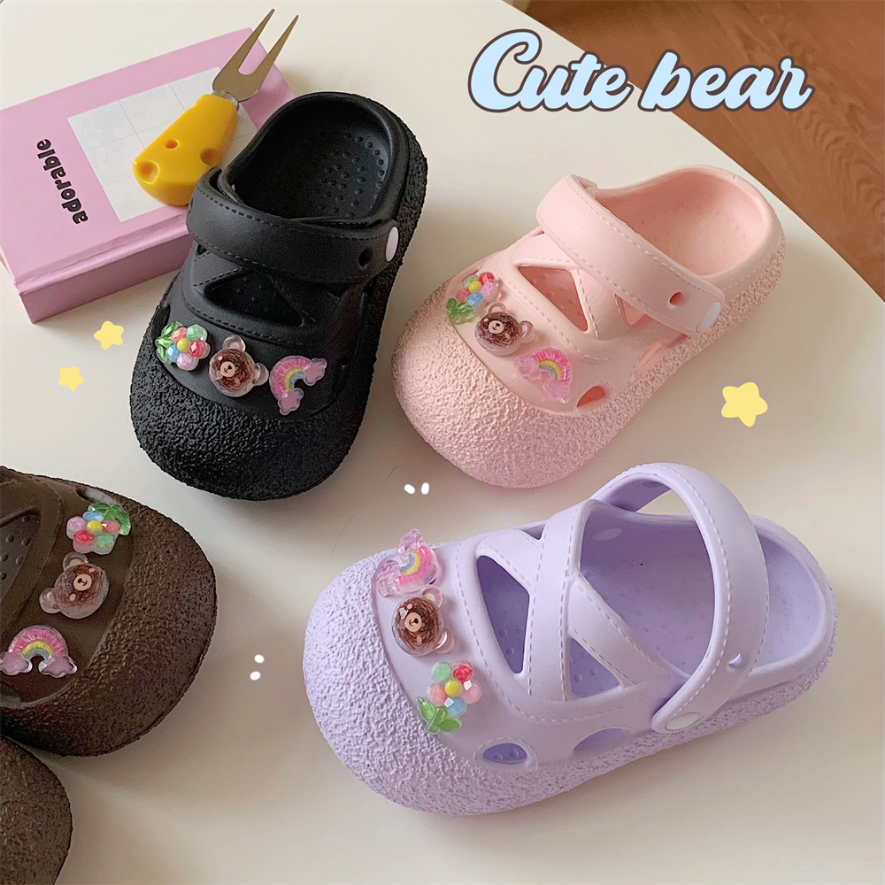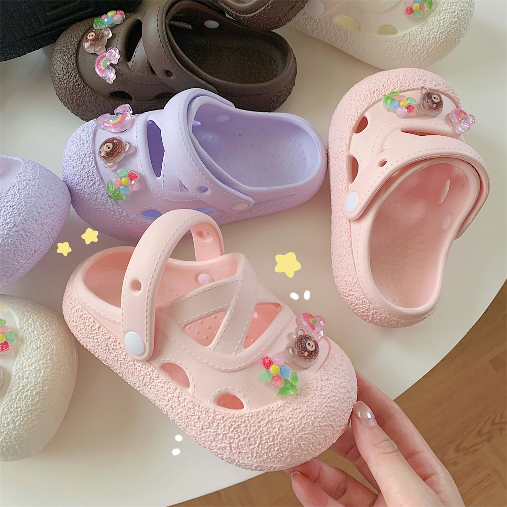 可爱花朵小熊女童包头洞洞鞋 外穿防滑软底儿童少女心沙滩凉鞋 夏季