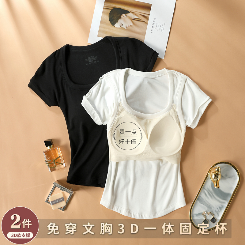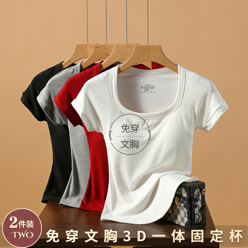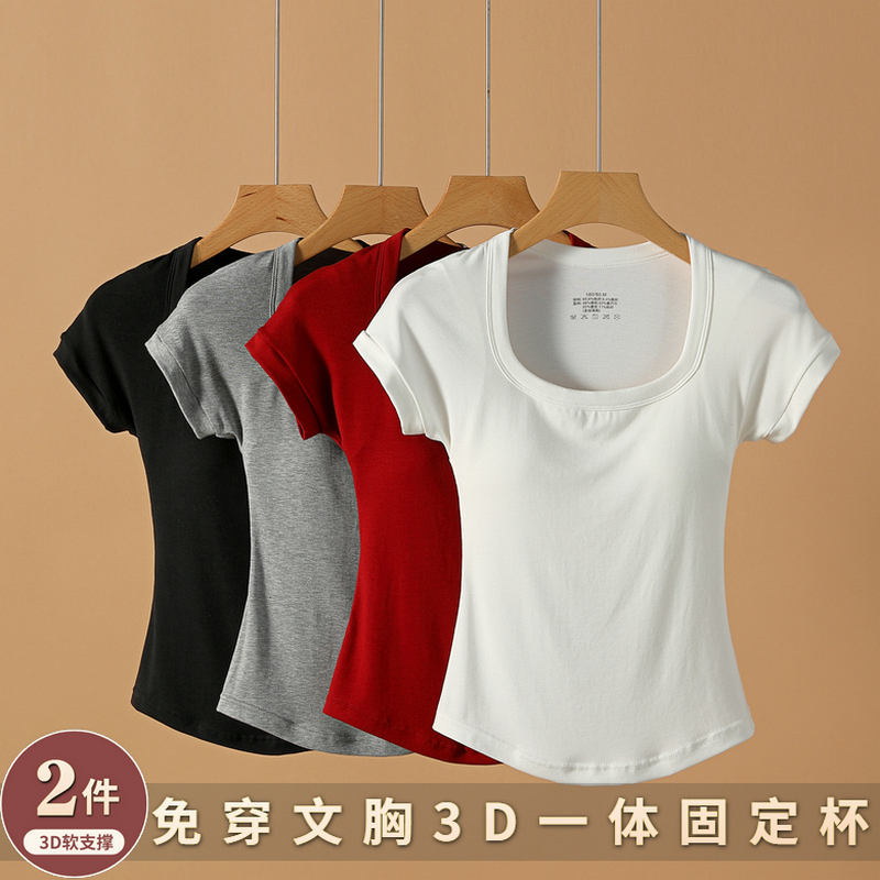 打底衫 黑色短袖 正肩U领带胸垫免文胸修身 夏季 上衣薄 t恤女2025新款