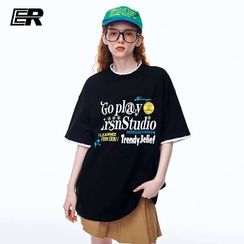 设计感小众潮牌上衣休闲情侣装 ER原创假两件国潮字母短袖 T恤夏季