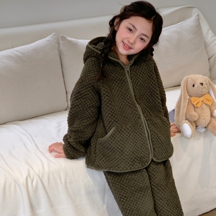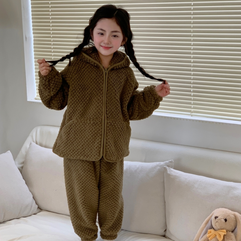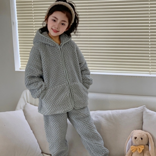 珊瑚绒加厚款 儿童睡衣男童秋冬季 法兰绒宝宝大中小孩戴帽 清仓