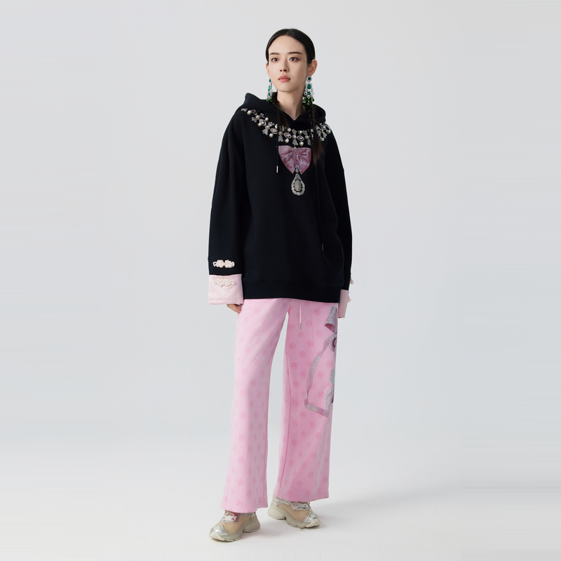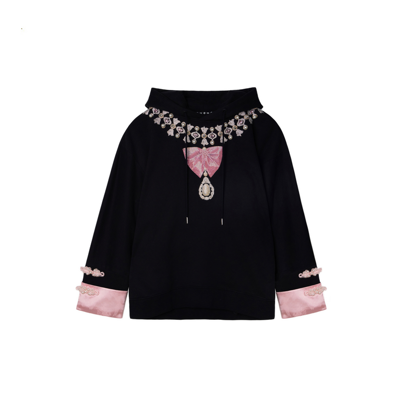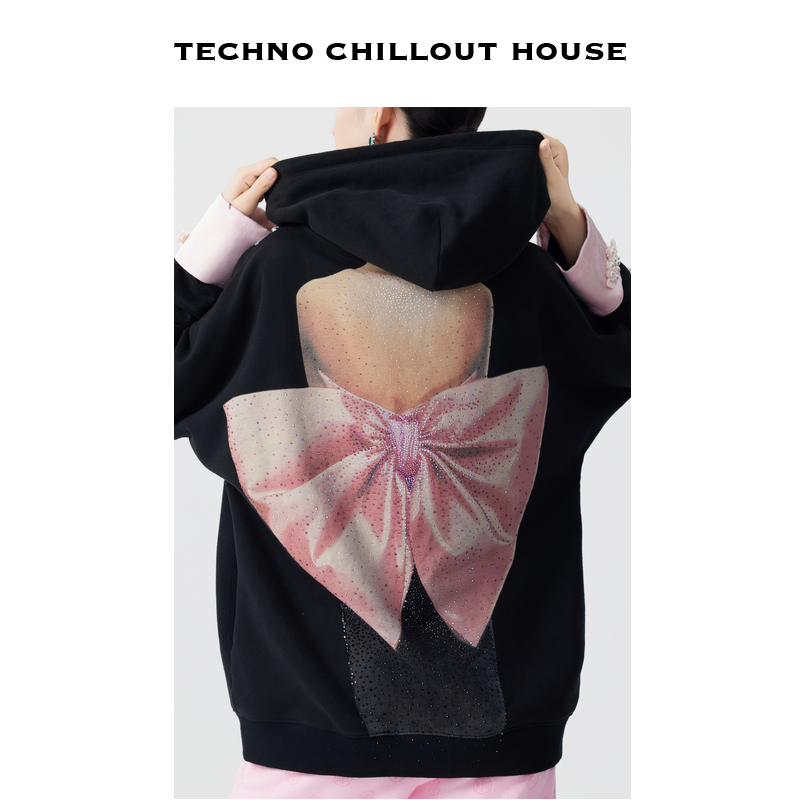 TCH潮牌烫钻蝴蝶结国风连帽卫衣女2024秋冬新款 宽松休闲套头帽衫