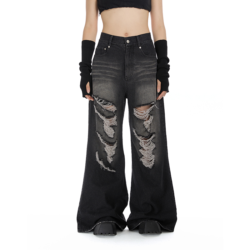 复古做旧宽松百搭微喇休闲长裤 BTW黑色猫须破洞阔腿牛仔裤 女美式