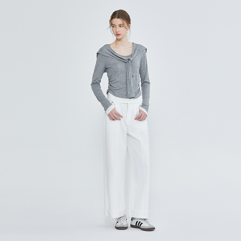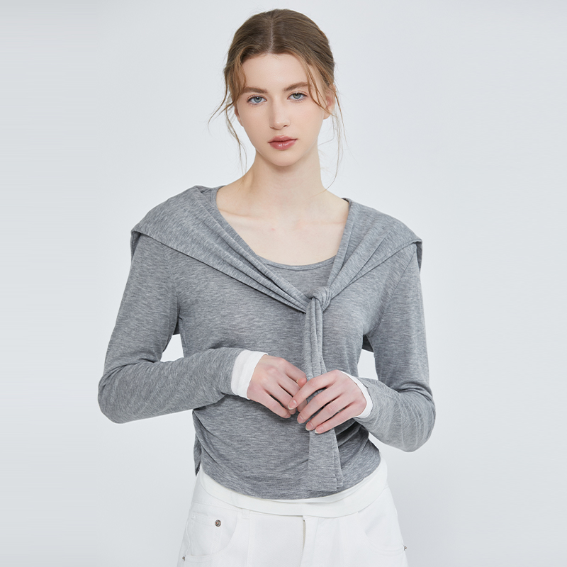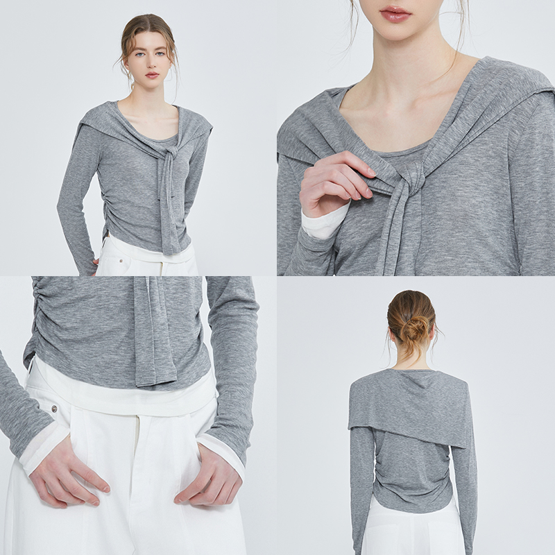 设计感小众带披肩上衣 2025年新款 北欧时刻质感灰色长袖 T恤女春季