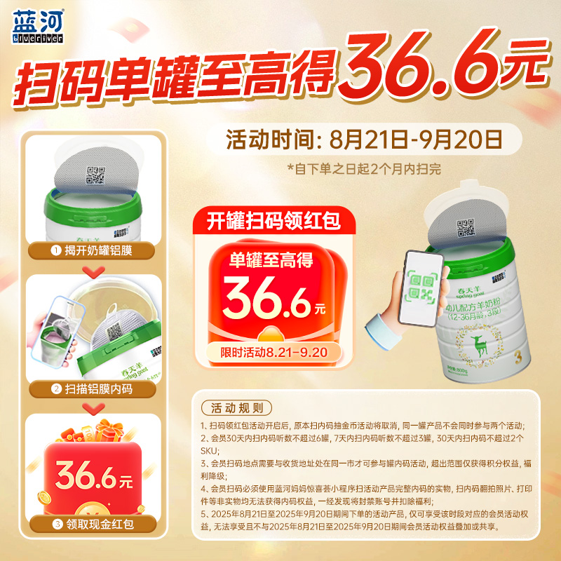 6罐进口奶粉 蓝河春天羊奶粉2段较大婴儿配方800g 6罐扫码 得72元