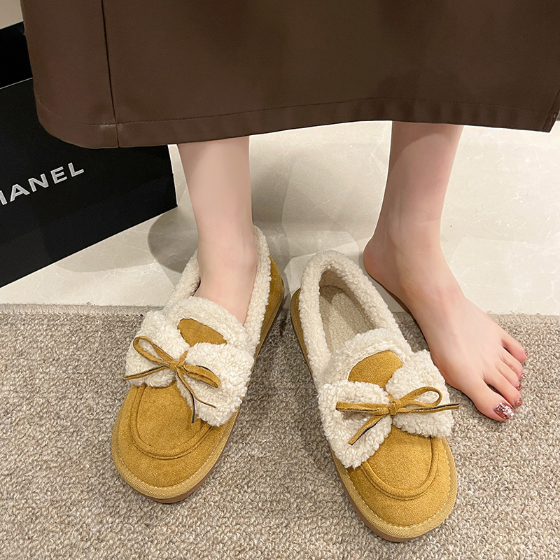 保暖一脚蹬棉鞋 蝴蝶结厚底豆豆鞋 外穿加绒加厚大棉鞋 新款 女秋冬季