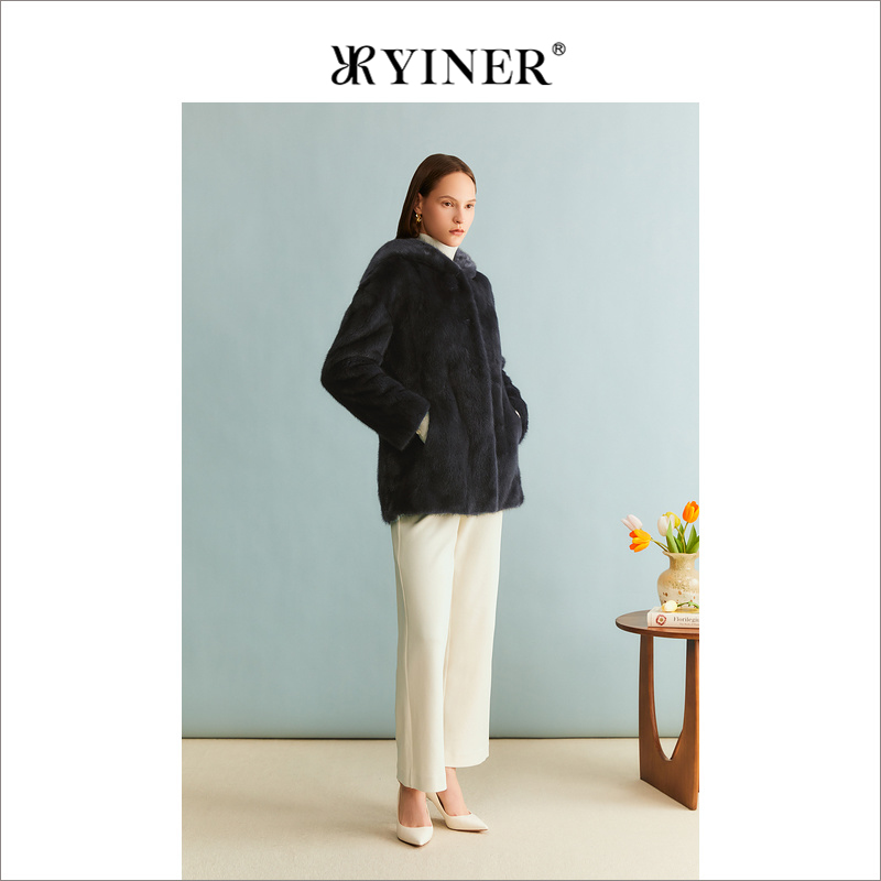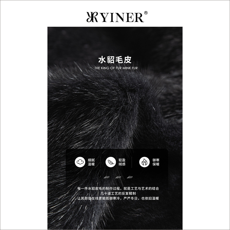 YINER音儿冬季 绒暖水貂毛皮真皮保暖连帽皮草廓形大衣