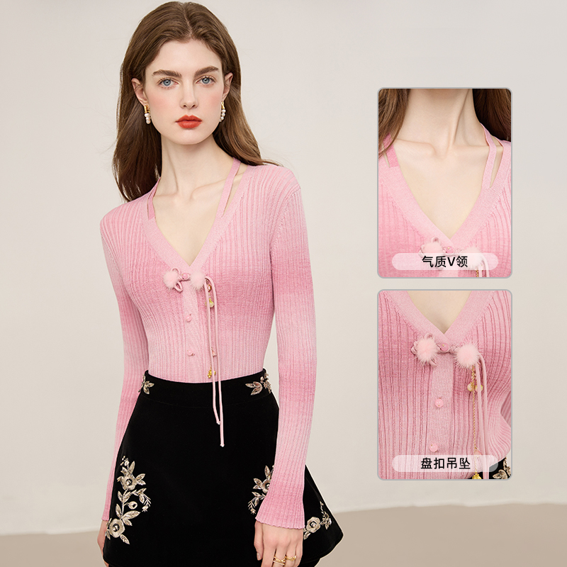 上衣女打底衫 渐变长袖 气质v领挂脖修身 针织衫 2024秋季 薄款 新品