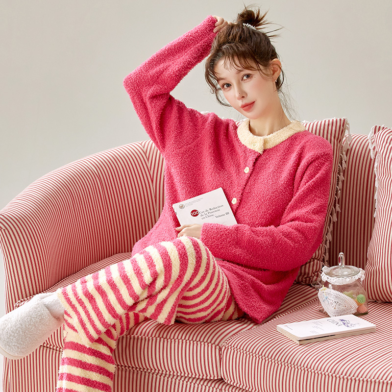 甜美可爱撞色少女睡衣秋冬加厚毛绒半边绒保暖开衫 条纹家居服套装