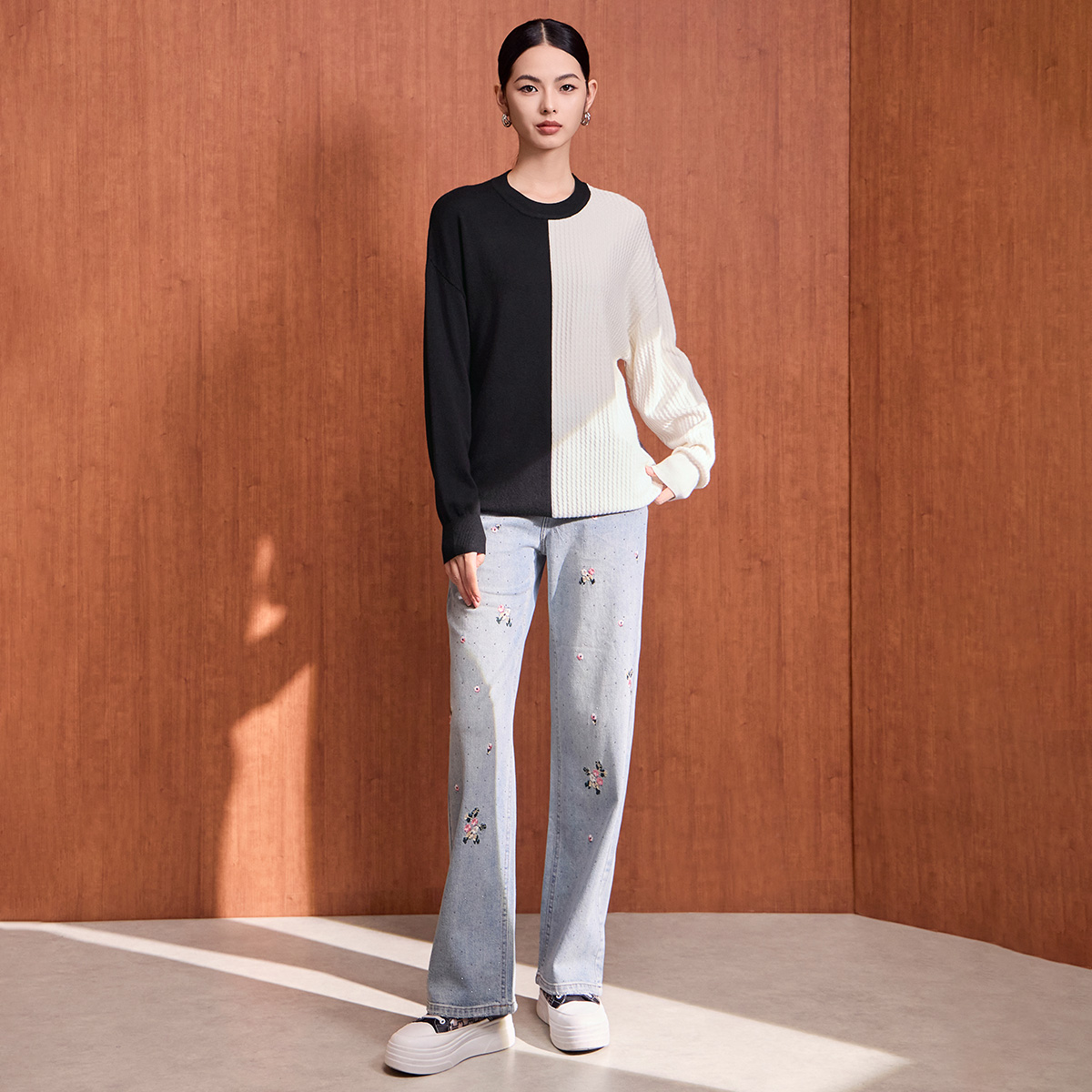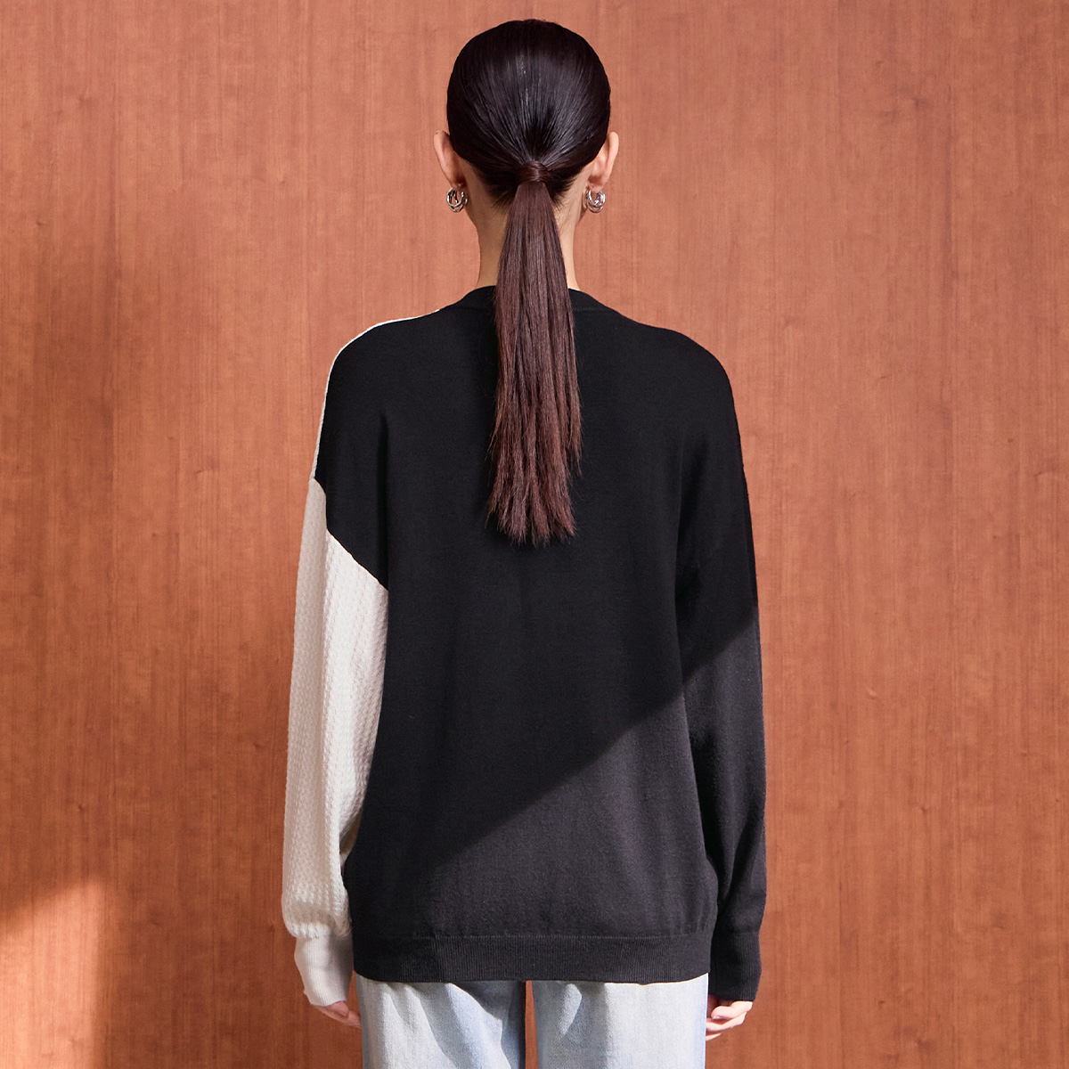 毛衣宽松波浪纹上衣女气质 圆领毛衫 马天奴秋冬新款 黑白拼色针织衫