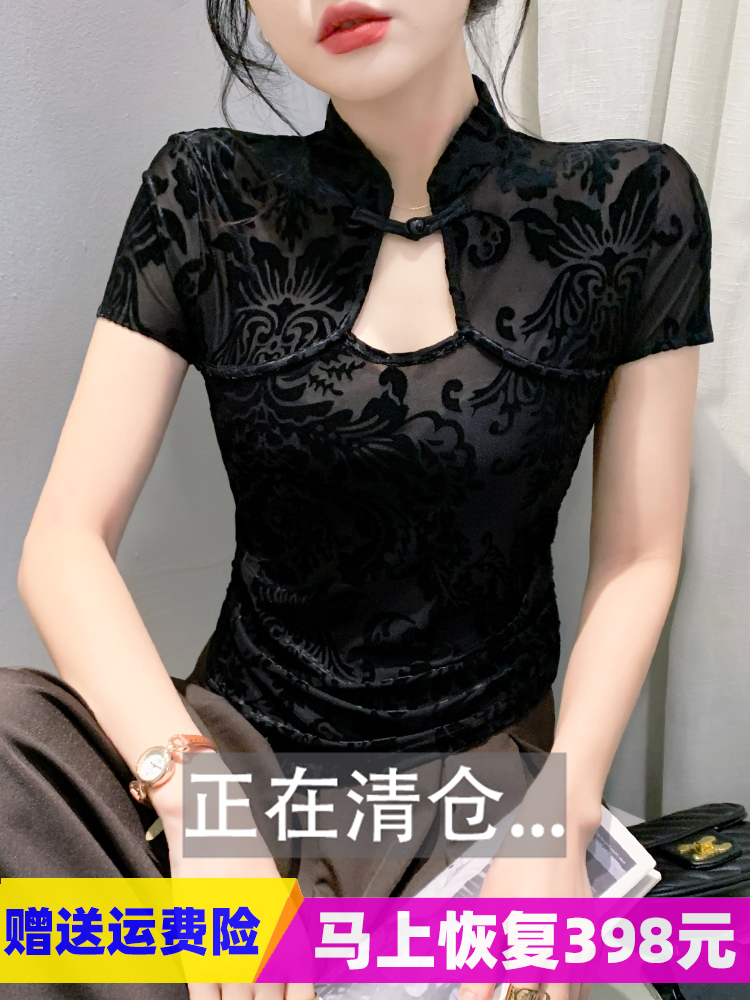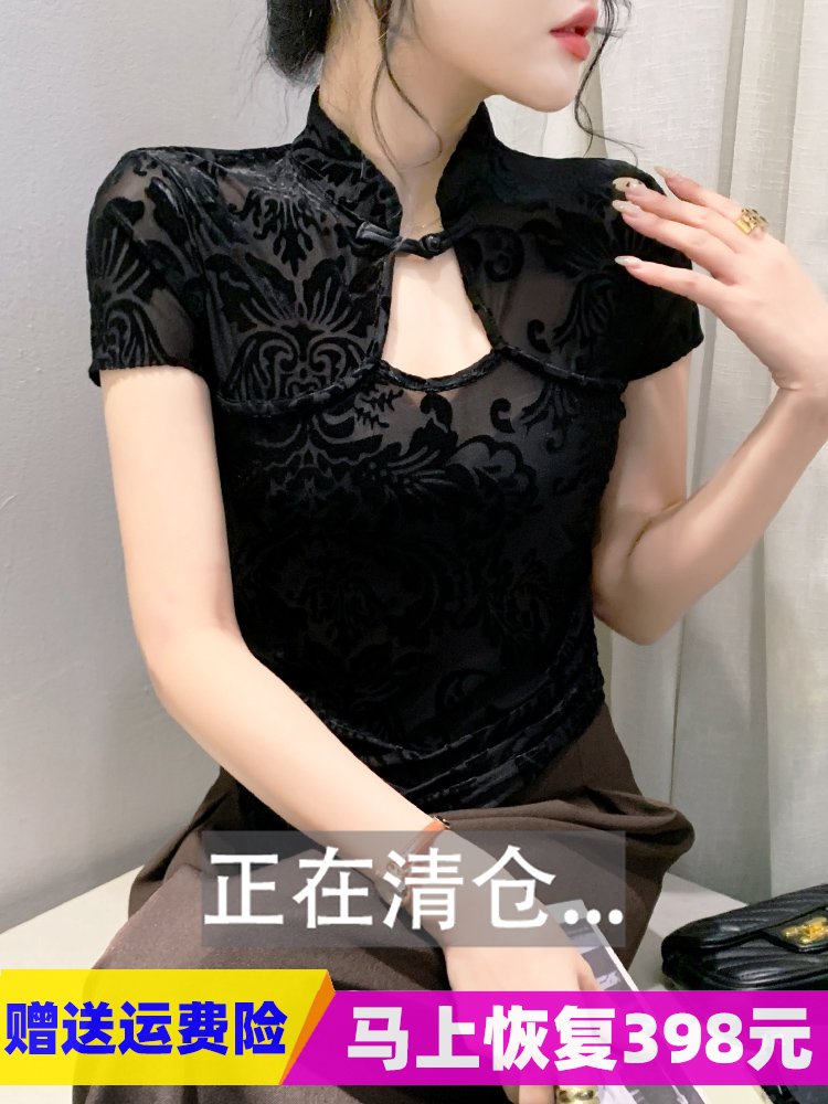 盘扣短袖 网纱上衣别致植绒小衫 T恤女夏季 修身 2024新款 国风新中式