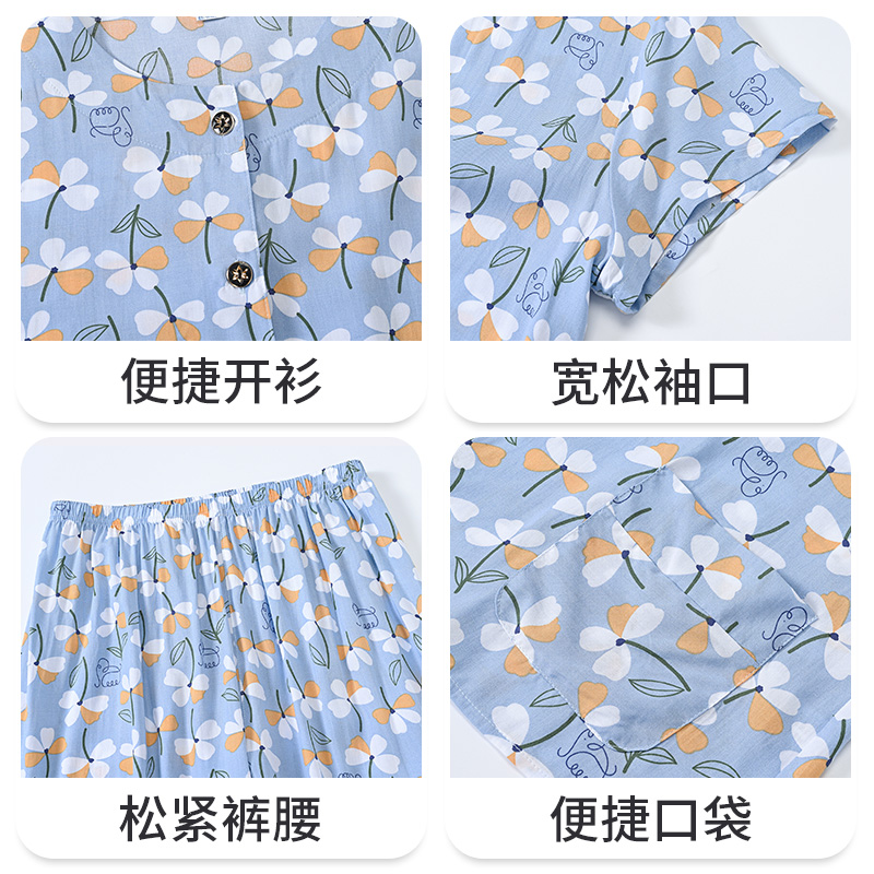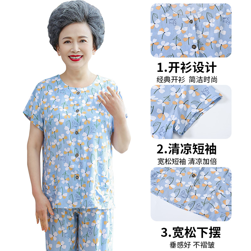 大码 妈妈睡衣女中老年人棉绸套装 家居服人造棉绵绸开衫 短袖 薄 夏季