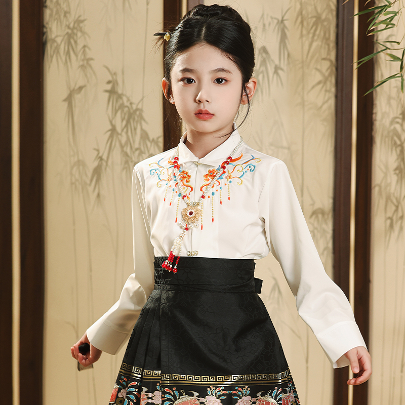 衬衣交叉领长袖 新中式 黑色秋 白衬衫 搭配儿童马面裙女童单上衣套装