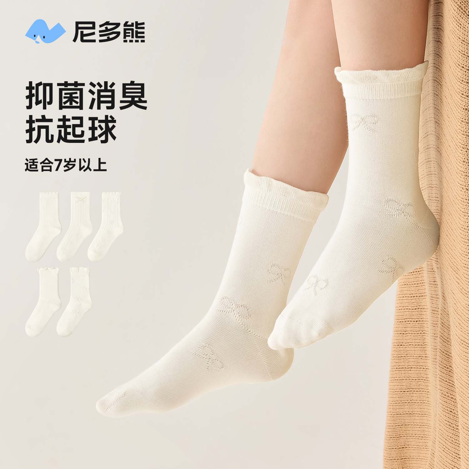 尼多熊2025儿童白色袜子a类春秋棉袜女中大童抗菌袜秋冬季 防臭袜