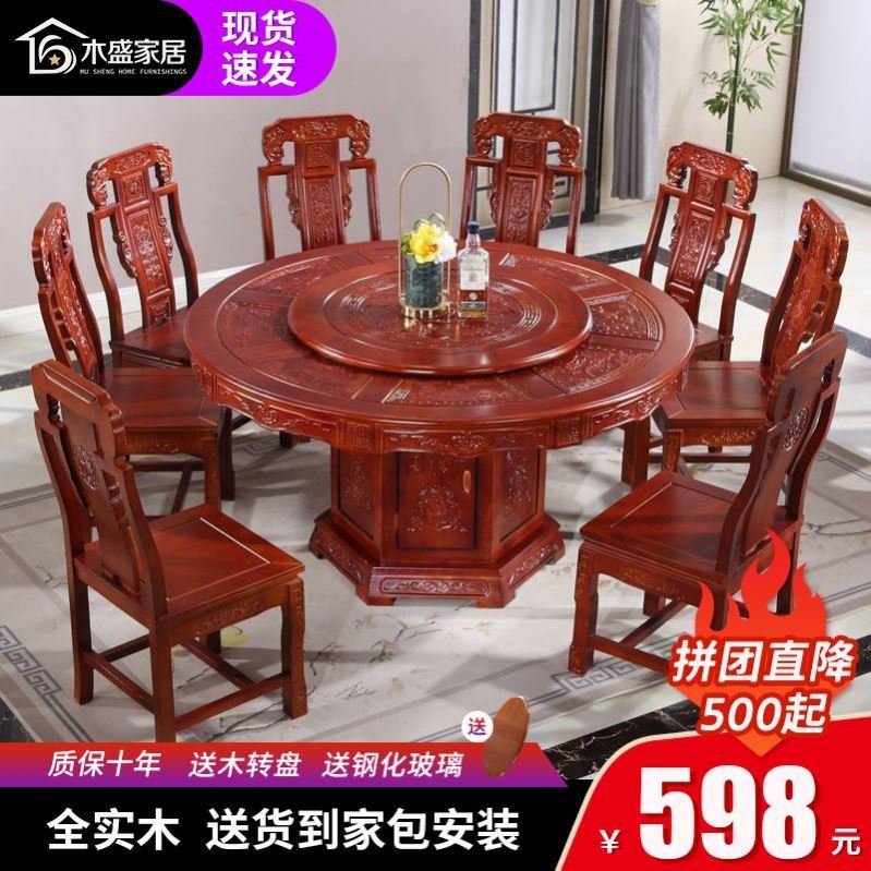 夜恋坊仿古典全实木餐桌椅组合吃饭桌小户型雕花圆形桌面餐桌家用