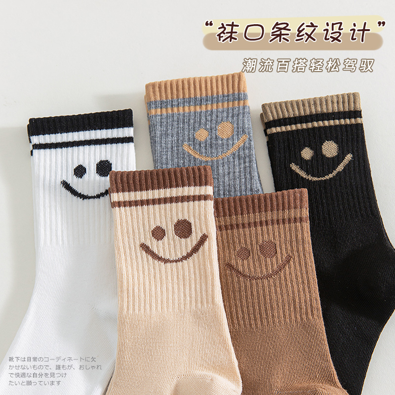 袜子女士中筒春秋季 纯棉防臭吸汗日系笑脸秋冬黑白色运动外穿长袜