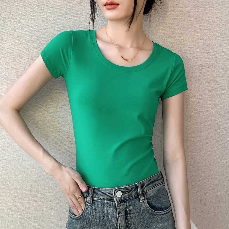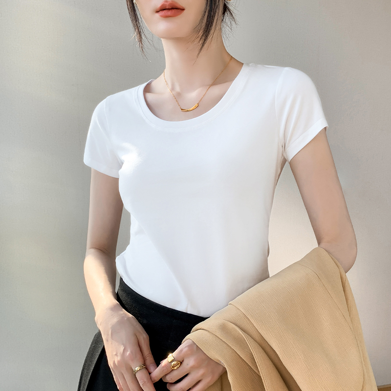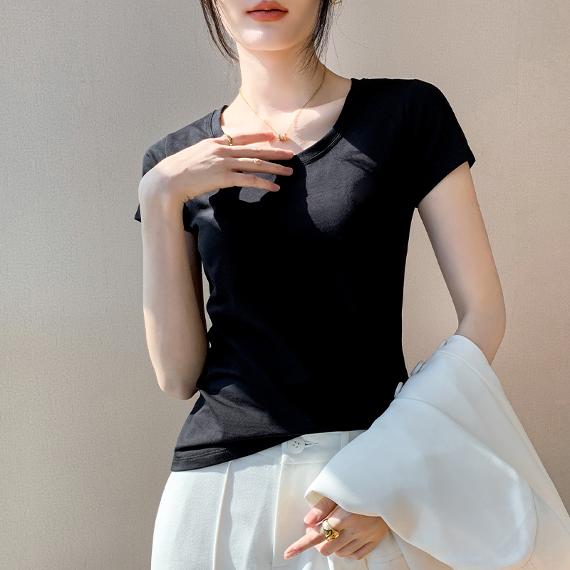 显瘦简约露锁骨百搭上衣 修身 歌倍尚正肩大圆领短袖 T恤女2025夏季