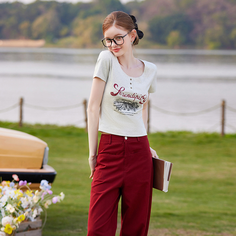 套头女式 白鹿语甜辣复古修身 简约时尚 25夏新款 T恤 显瘦印花短袖