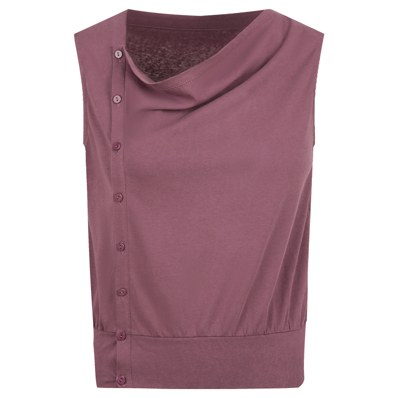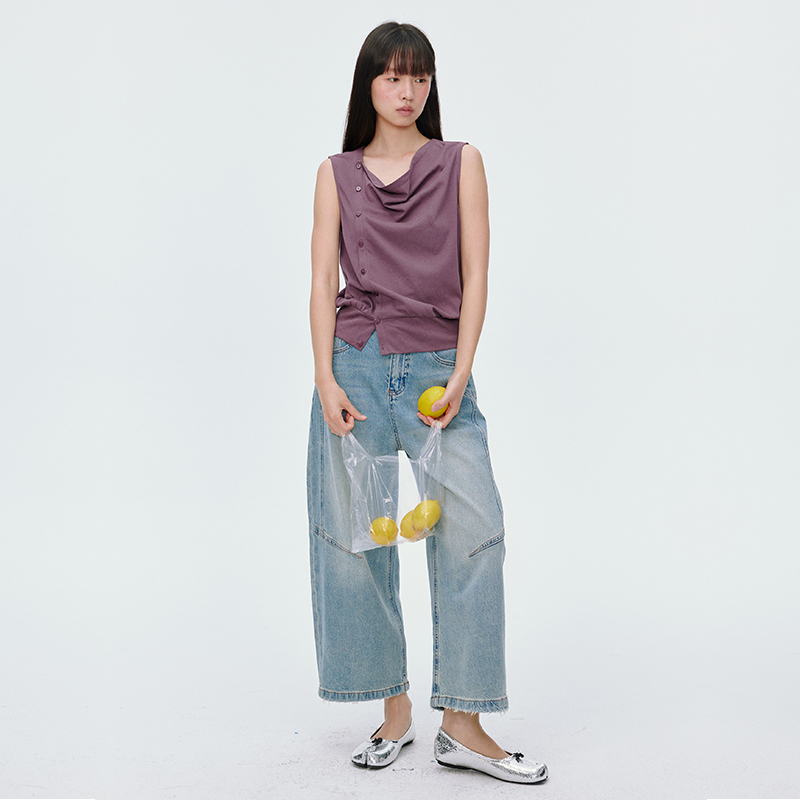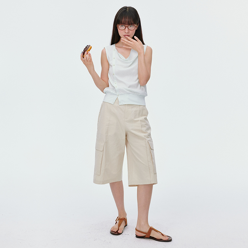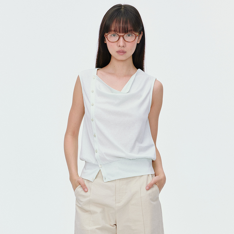 T恤 气质显瘦短袖 omont蛋挞家复古荡领斜门襟无袖 针织上衣2025夏季