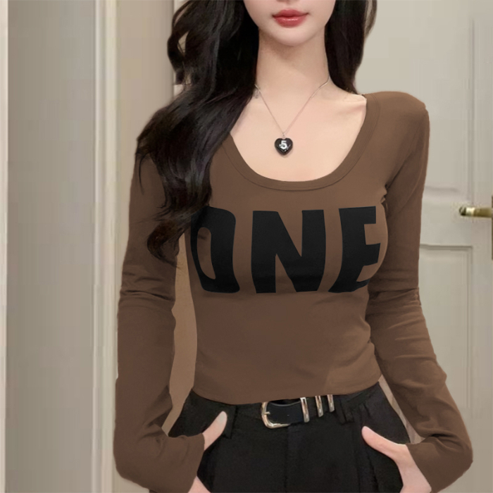 短款 打底衫 黑色性感U领撞色字母气质修身 2025春秋季 T恤上衣 女长袖