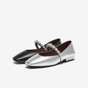 方头粗跟女单鞋 百思图2025春季 银色玛丽珍鞋 法式 E5516AQ5 商场新款