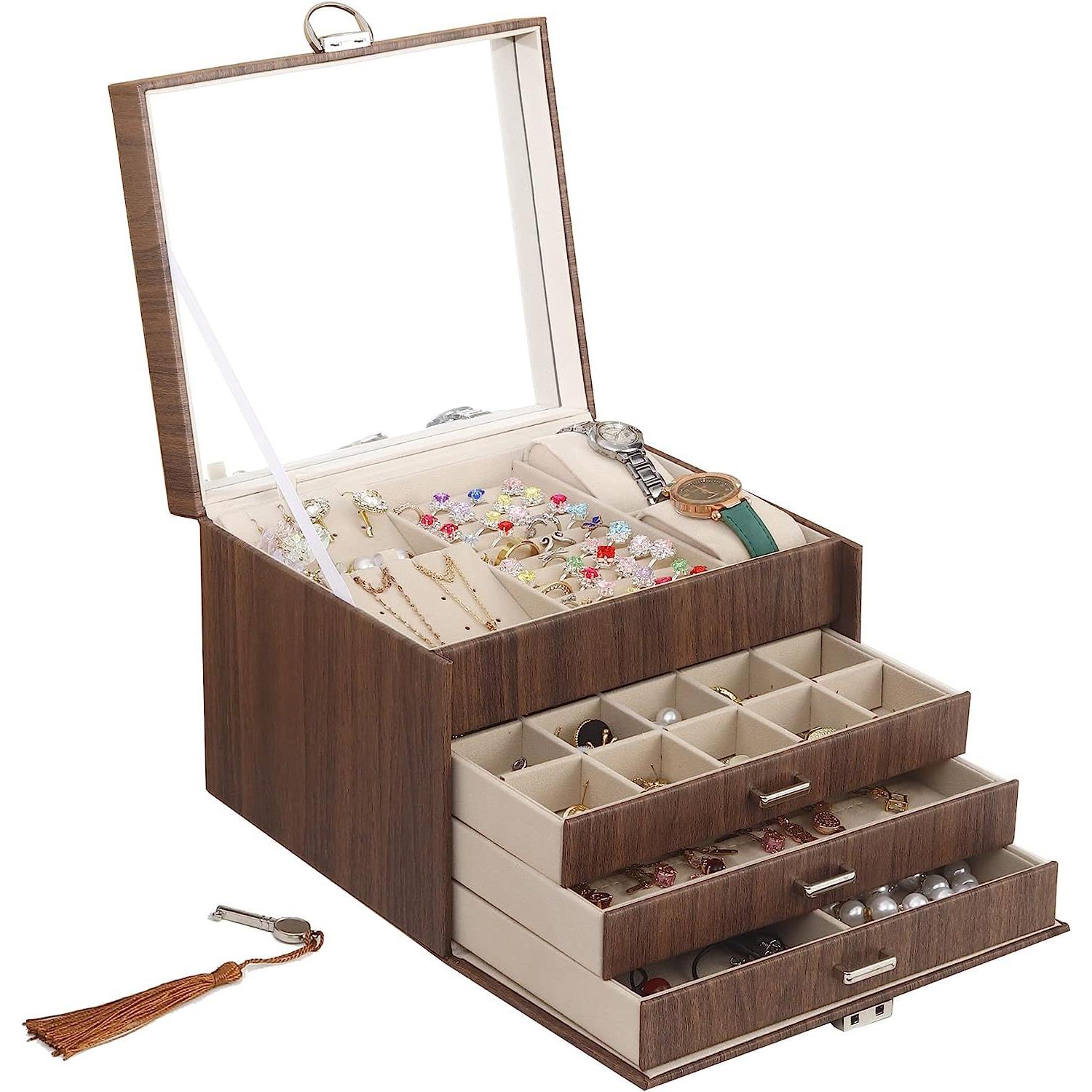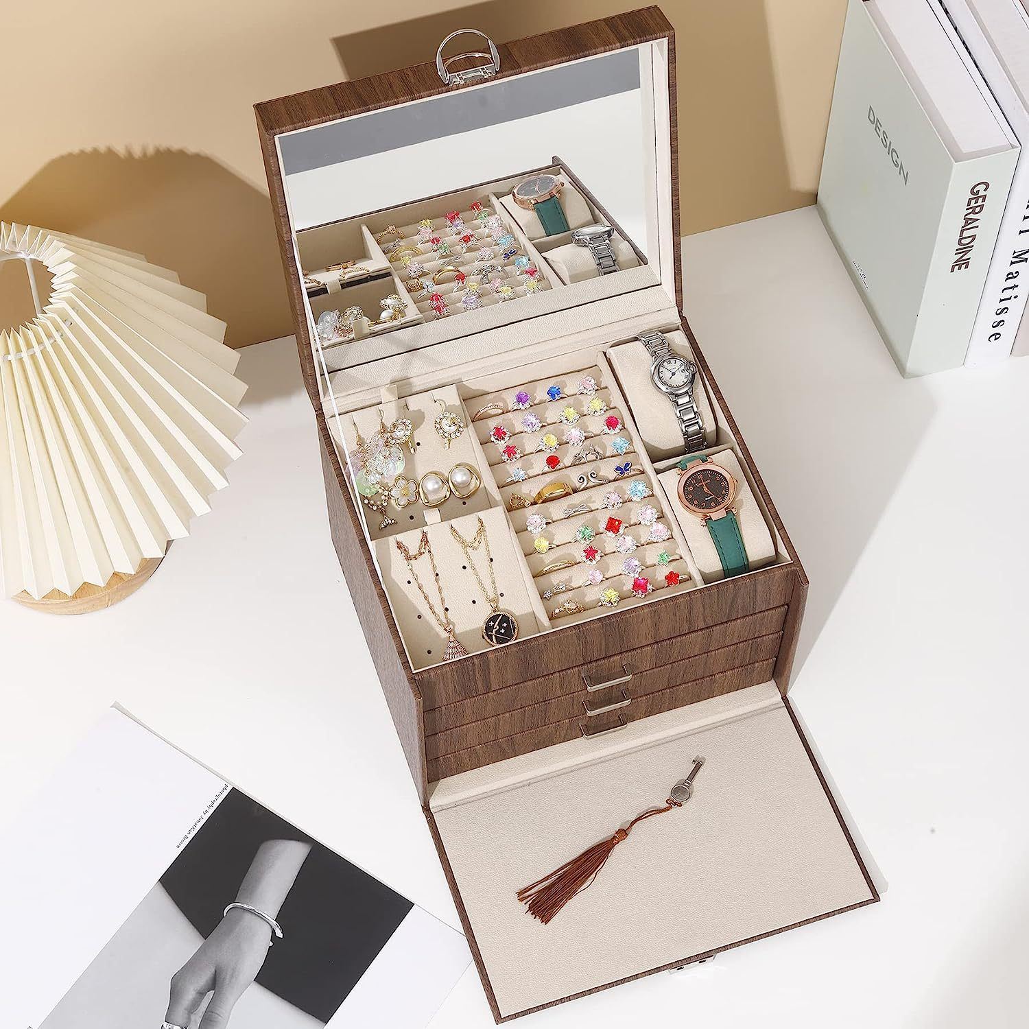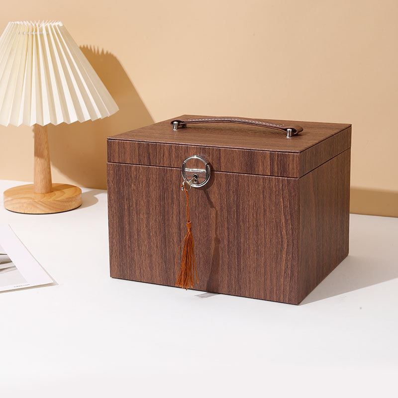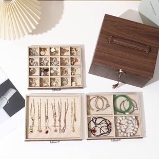 新款 手提木纹PU首饰盒多层大容量节日送礼化妆品金银珠宝首饰收纳