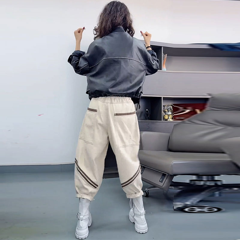 时尚 牛仔哈伦九分裤 套装 立领休闲皮衣外套 两件套 女春秋新款 大码