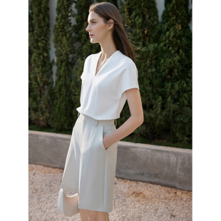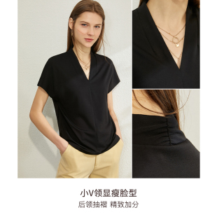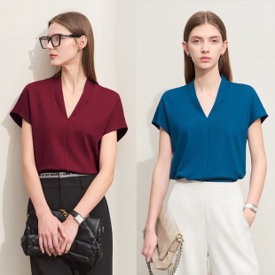 Amii2025夏新款 纯色直筒60支弹力罗马布上衣 气质V领连肩短袖