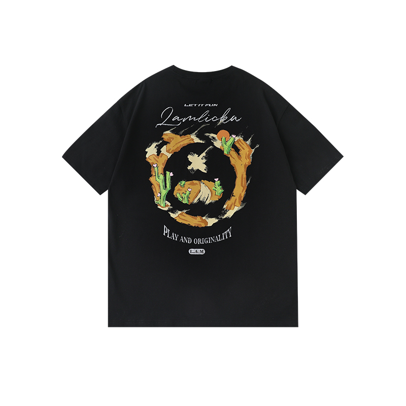 重磅纯棉宽松潮牌黑色t恤 男夏季 LAMLICKA仙人掌印花美式 复古短袖