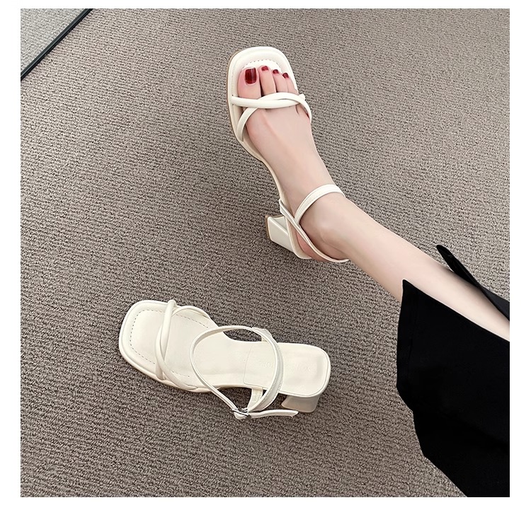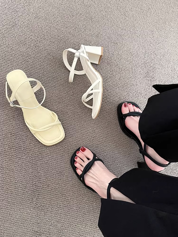 百搭方头罗马法式 一字带粗跟凉鞋 仙女风配裙子时尚 夏季 女2025新款