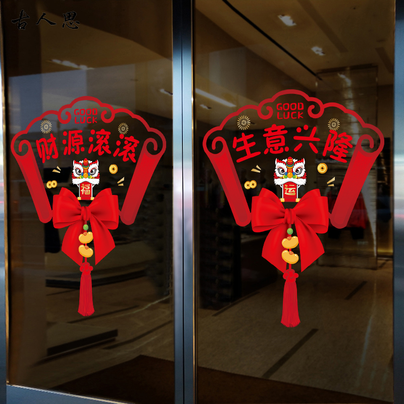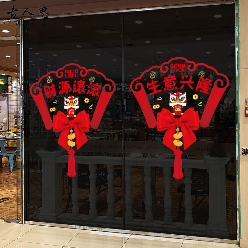 饰玻璃门贴纸 店橱窗蝴蝶结装 2026新年中式 折扇静电贴画商铺服装