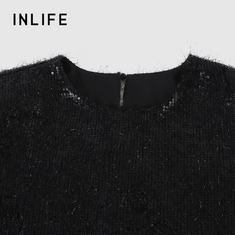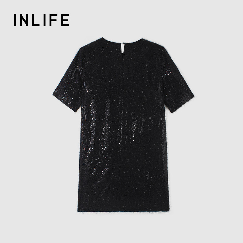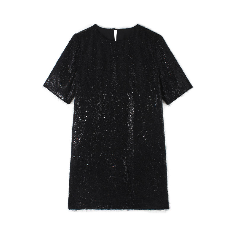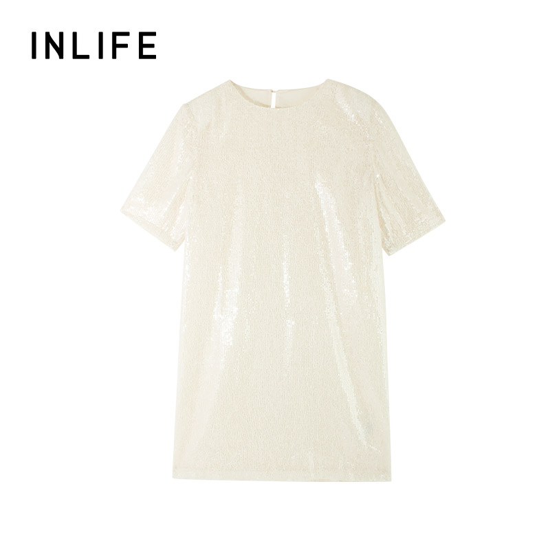 中裙 气质宽松T恤裙时尚 伊纳芙高级圆领珠片短袖 连衣裙2025秋新款