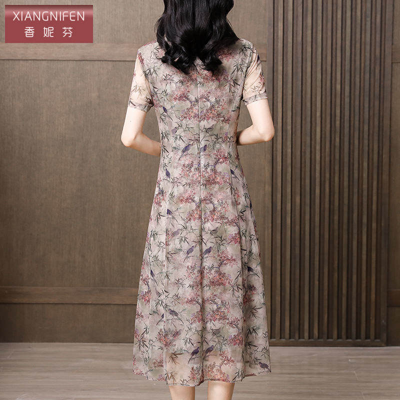 菲梦伊100桑蚕丝连衣裙女喇叭袖 高端品质双绉真丝镶钻长裙子 夏装